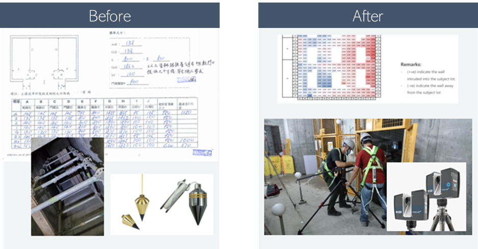 Hip Hing Construction is working with RaSpect on a project measuring the straightness of an elevator shaft. Compared to the previous manual method that requires building scaffolding within the shaft and dropping a line from the top down to the bottom of the shaft, RaSpect’s solution measures the elevator shaft straightness every 5-6 floors without requiring workers to be present. Not only does this improve worker safety, it also increases the speed of checking the straightness, reduce manual work, and improves accuracy and efficiency.