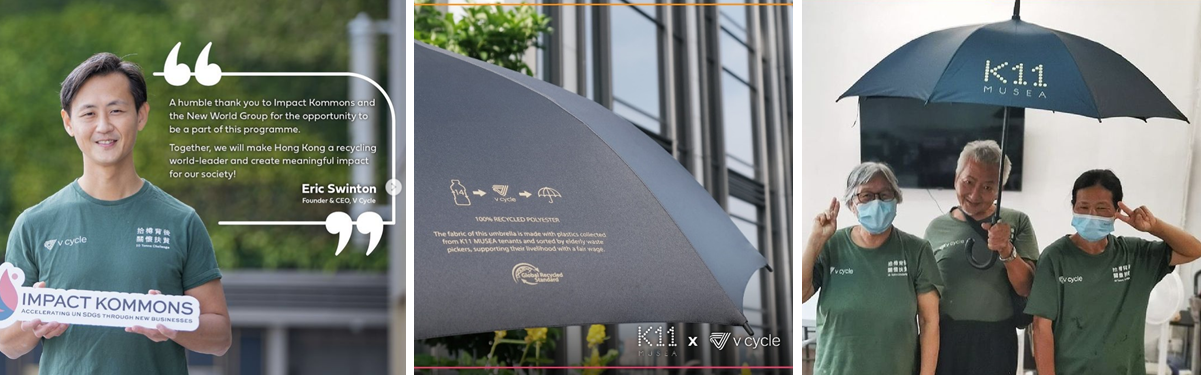 V Cycle works with the elderly who usually pick up cardboards around Hong Kong by providing them with better employment opportunities through sorting plastic and earning a higher wage. V Cycle worked with 30 of K11 MUSEA’s tenants to collect their plastic waste, and then sorting and turning them into umbrellas that are now being sold on K11’s eShop.